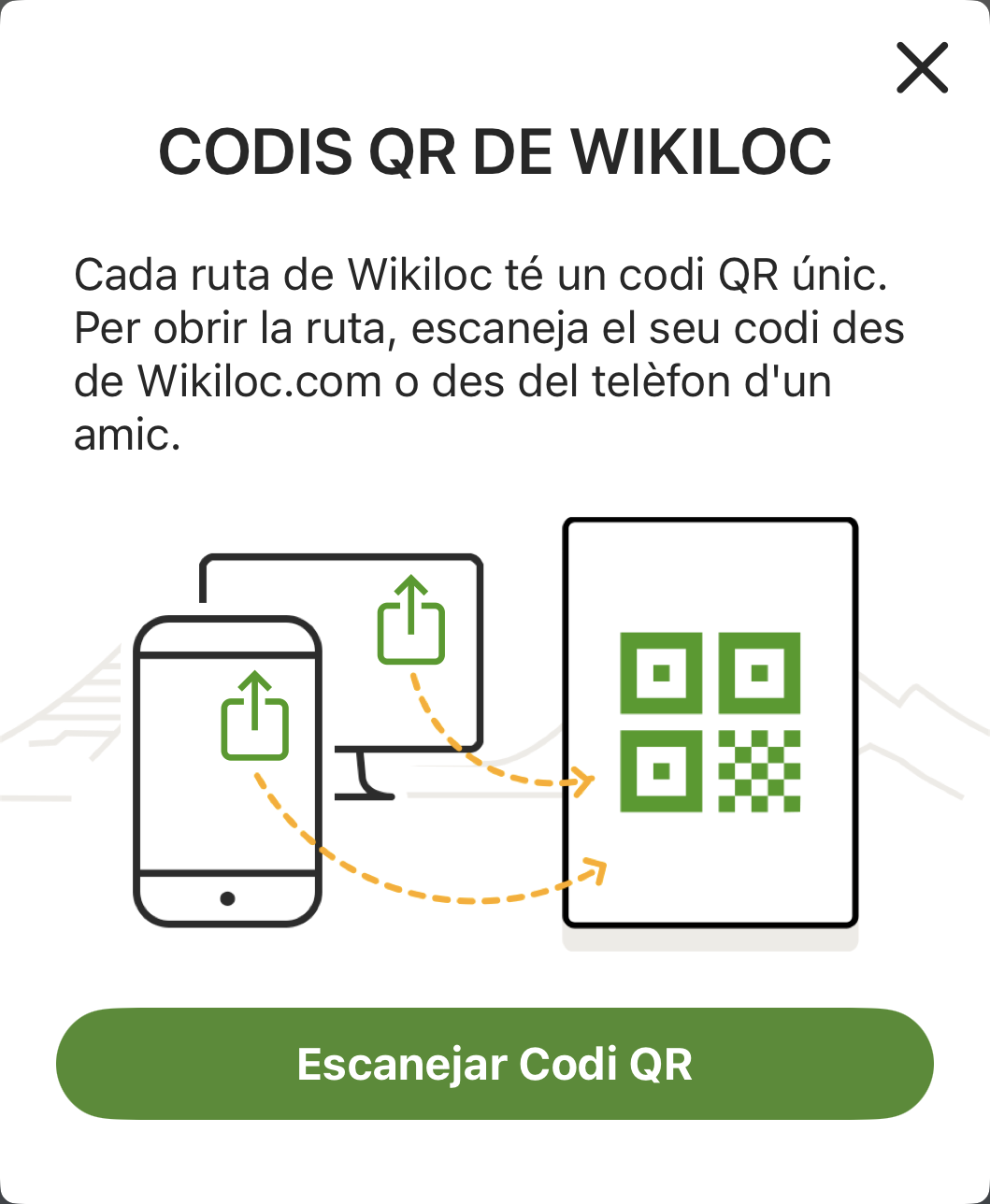 - A les opcions de descàrrega de rutes al web (per visualitzar el codi QR, cal haver iniciat sessió al teu compte de Wikiloc).