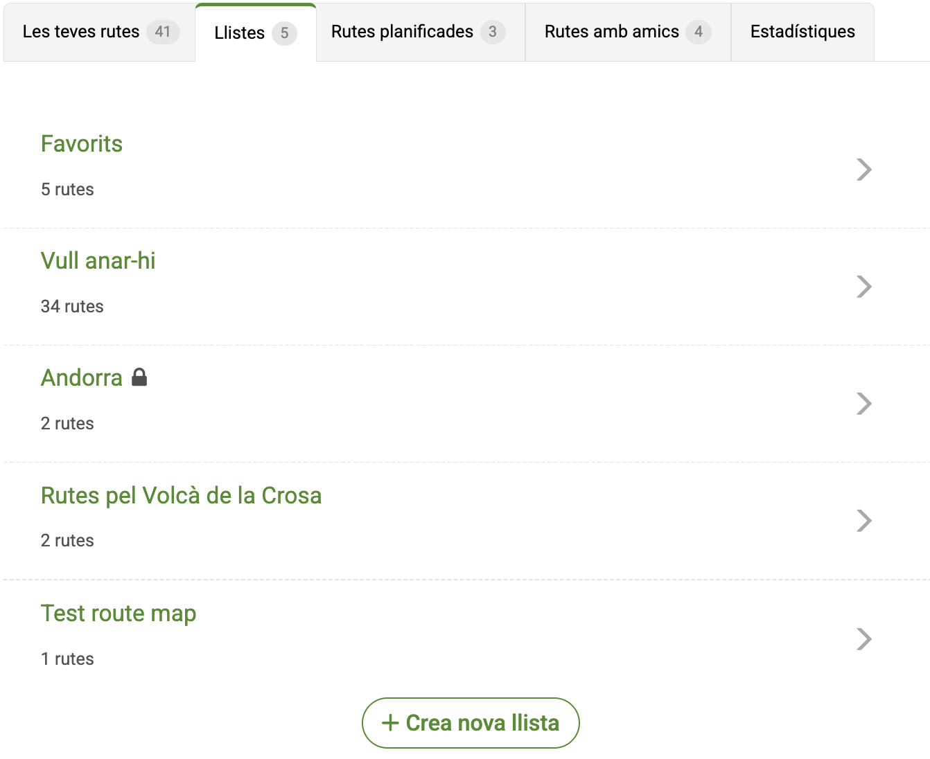 - Per crear una llista de rutes, ves a la pestanya "Les teves llistes" del teu perfil i fes clic sobre el botó "+ Nova Llista" que hi ha a la part inferior de les dues llistes permanents.