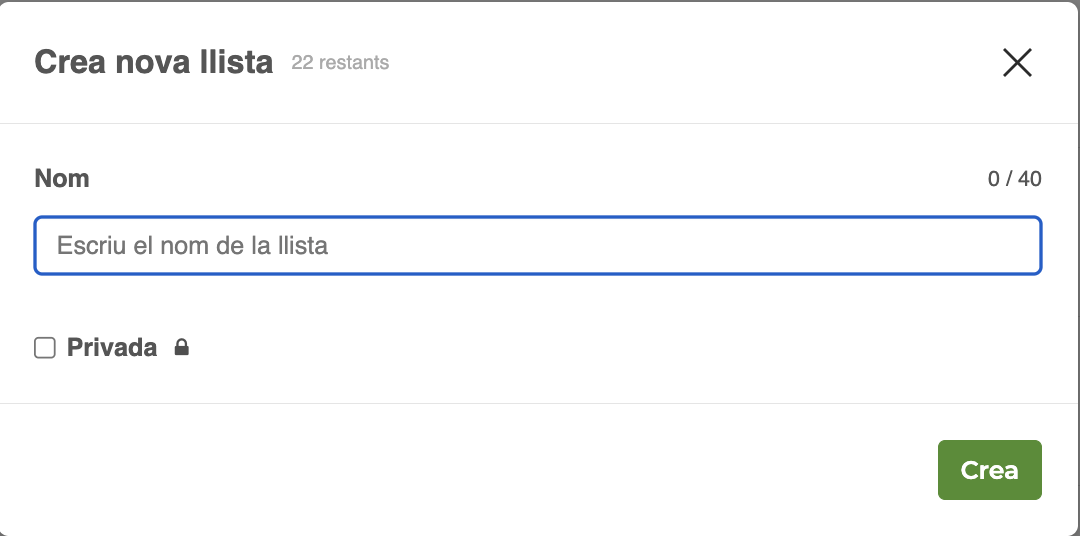 - Introdueix un nom per la nova llista. Si vols que sigui privada, marca la casella "Privada" (les llistes privades només són visibles per a tu i no es poden compartir).